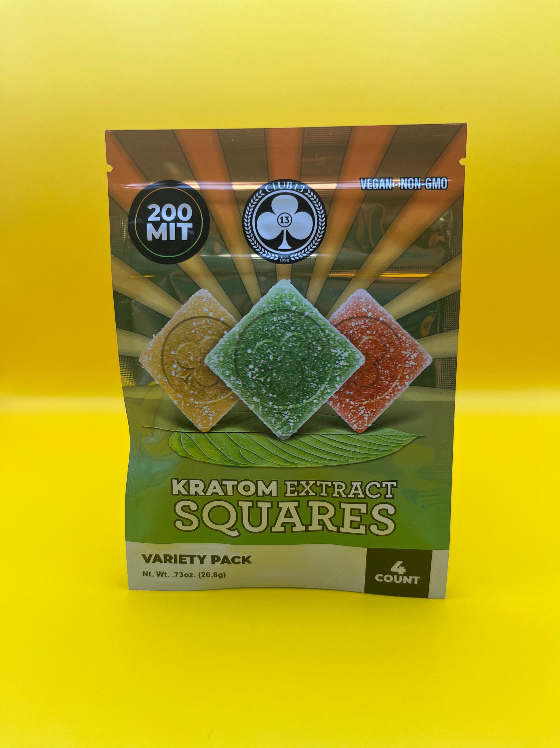 Introducing Kratom Squares! These colorful pectin squares contain 50mg of mitragynine each, making them a convenient way to enjoy the benefits of kratom. Kratom Squares come in two sizes, 4 count and 10 count, so you can choose the option that works best for you. With four fun varieties to choose from—Cherry Lime, Red Apple, Tropical, and a Variety Pack—there is something for everyone