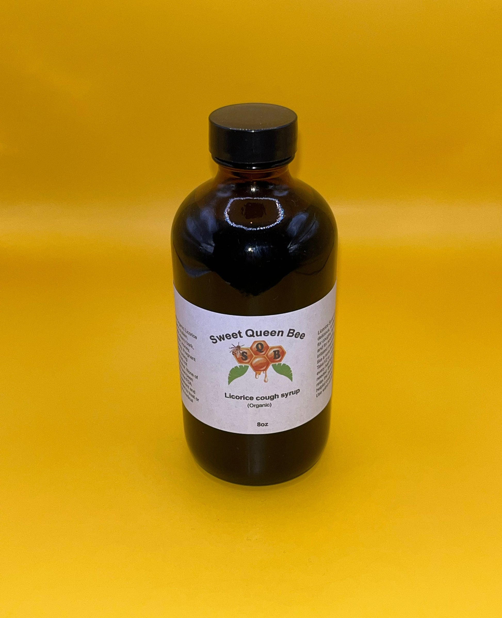 The syrup is not just delicious, sweet, and it's effective for soothing irritated membranes. Like sore throat, coughs, and laryngitis. It contains Organic Licorice Root, Organic Mullein Leaf, Organic wild cherry Bark, Distilled water and honey.